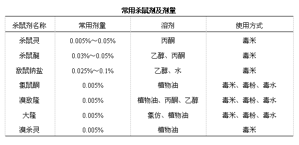 ①防制方法 物理防制法:对在临时聚居地及周围进行堵洞,堵洞时可以配合磷化铝片,在堵洞时可以由专业人员使用,每洞一片,然后将洞堵死,并防被鼠重新盗开。贮存粮食及食物的地方最好建防鼠台,也可以用鼠夹(笼)进行捕杀。 化学灭鼠法:在人群聚居地禁止使用急性鼠药和国家明令禁止使用的鼠药(如:甘氟、氟乙酰胺、毒鼠强、氟乙酸钠、毒鼠硅),可以使用慢性杀鼠剂,如:抗凝血类药物、生化灭鼠剂,部分杀鼠剂的使用浓度和溶剂见下表,产品化灭鼠剂按说明书要求使用。 ②灭鼠后所需要做的工作 鼠尸的处理:统一处理、焚烧深埋均可,但以焚烧为好。深埋处理时应当在填埋时,适当喷洒消毒剂对其进行处理。 鼠体寄生虫的杀灭:在投放鼠药后的4—5天,应及时搜寻死鼠。居住周围的环境加强杀虫,同时管好猫、狗及牲畜,以防间接传播寄生虫和媒介疾病给临时居住人群。 ③杀鼠剂中毒后的解毒剂 一旦发生误食等杀鼠剂中毒情况应立即进行相关救治处理,其中抗凝血类杀鼠剂解毒用维生素K1治疗,溴杀灵可用苯巴比妥治疗,含氟类杀鼠剂用解氟灵(乙酰胺)治疗。